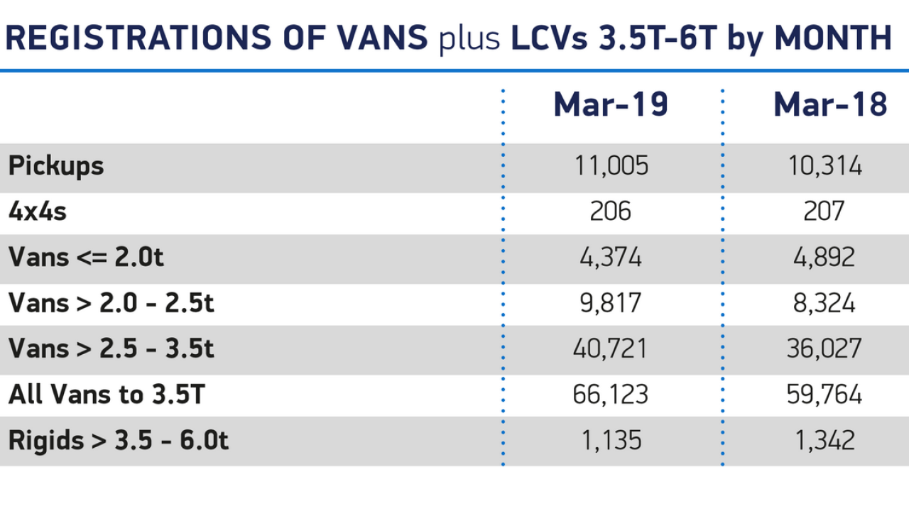 More than 66,000 new vans and pick-ups were bought in March compared with the same month in 2018, an rise of 6,359 units. Both medium vans weighing 2.0-2.5 tonnes and large vans weighing 2.5-3.5 tonnes saw growth, with demand rising by 17.9% and 13.0% respectively. Registrations of pick-ups also rose, by 6.7%, to more than 11,000. Meanwhile small vans weighing less than 2 tonnes experienced a decline, falling -10.6%.