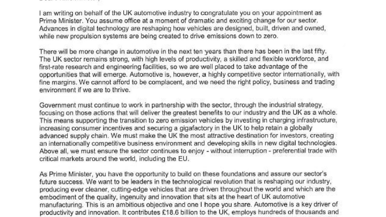 I am writing on behalf of the UK automotive industry to congratulate you on your appointment as Prime Minister. You assume office at a moment of dramatic and exciting change for our sector. Advances in digital technology are reshaping how vehicles are designed, built, driven and owned, while new propulsion systems are being created to drive emissions down to zero.